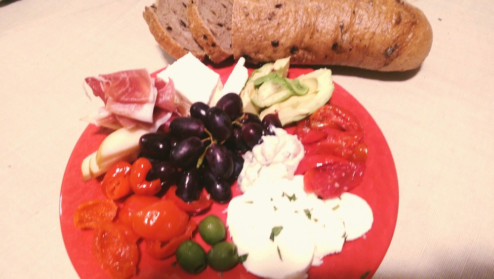As you can see from the plate it’s really going to be delicious. What I did: I bought a loaf of olive bread, sliced that up and I bought some delicious double cream brie and a true sheep’s milk feta, fresh mozzarella and some of these awesome little peppers that I love that I’ve told you about before they’re called Pepe due there from Africa and some roasted tomatoes in olive oil and herbs. If you’ve never tied these tomatoes they are fantastic usually you can find them in the deli section or in the olive bar section which is where I found them in our store they go with everything. And in the winter time especially, they satisfy your craving for tomatoes without having to use those nasty tasteless pale tomatoes that we have available in the winter time. I also found these delicious olives they are unique they’re really bright green and they have this delicious buttery flavor vs the really strong green olive flavor that although my husband likes that flavor I do not. I paired all of this with some fresh sliced pairs some Italian prosciutto directly from Italy with no preservatives or nitrates and from humanly raised pork and some awesome seedless black grapes that are not usually available this time of year but for some reason they were and they are awesome.