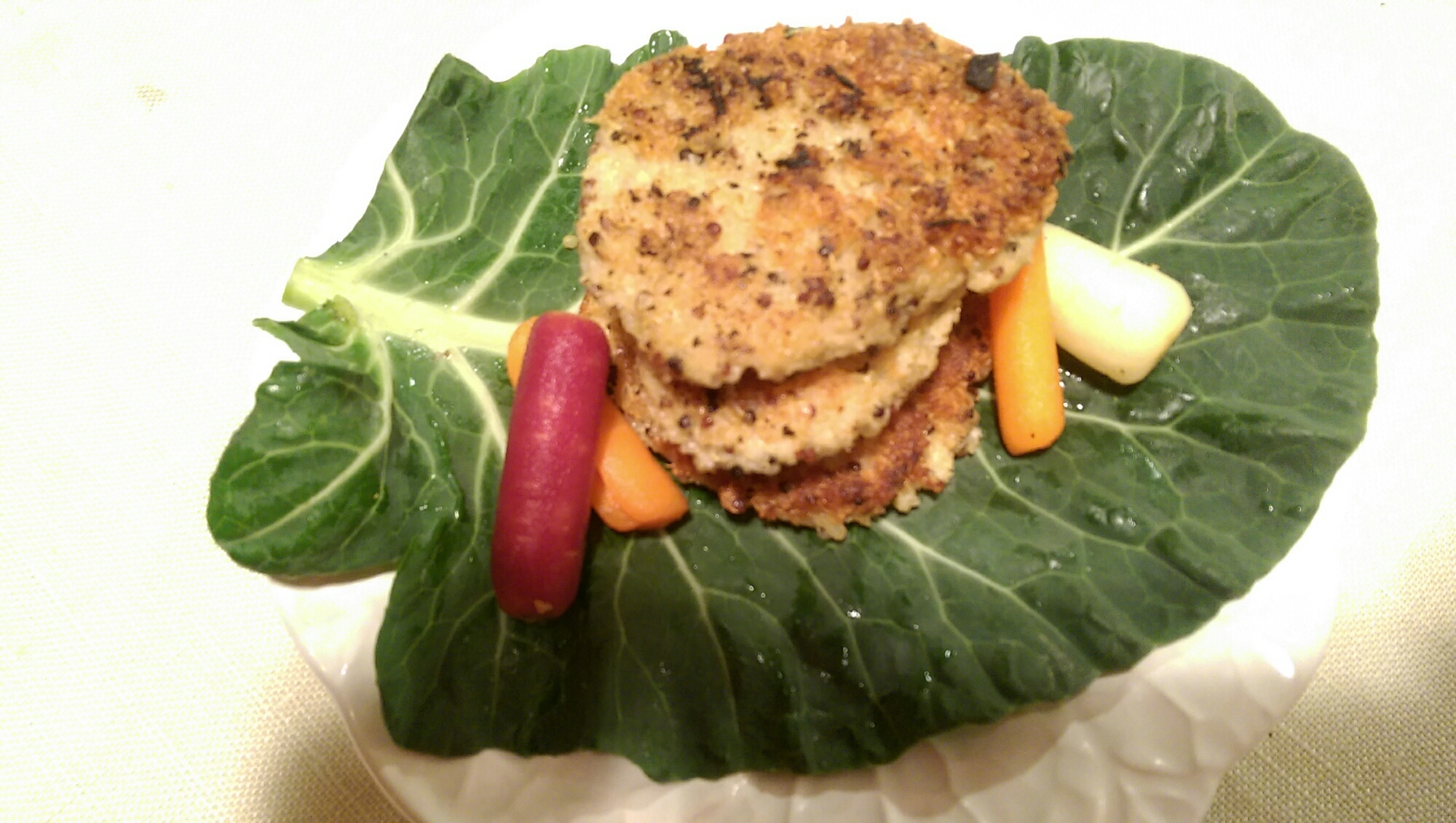 Place them into a hot skillet with about a quarter inch of good, high heat tolerant, cooking oil like grape seed or avocado oil and fry them nicely on each side until golden brown. I wanted to cook these quickly because I did not want them to continue to overcook the quinoa and become mushier so I had them on medium to medium-high heat. Watch them very carefully, they firmed up really nicely and I served them with stuffed collard rolls and a wonderful red pepper and tomato sauce. The meal turned out delicious and the patties were a big hit.