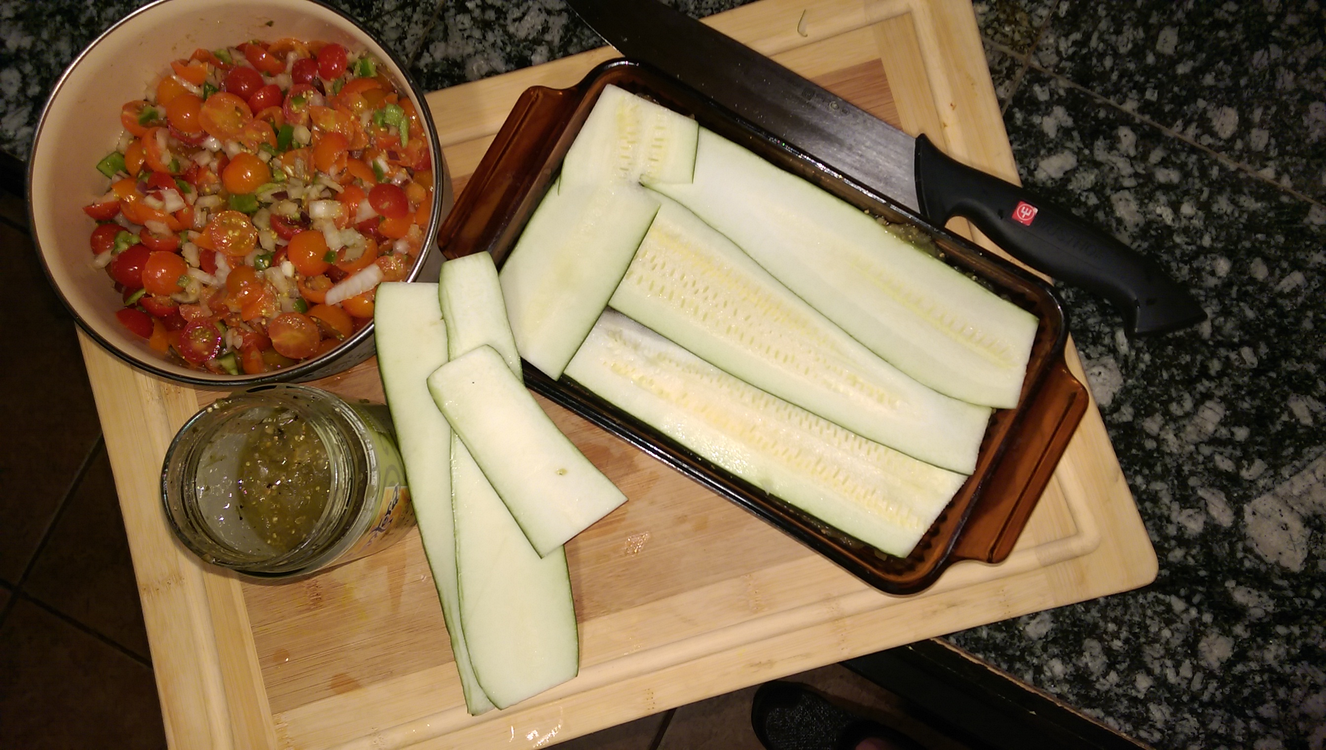 Filling: In a skillet, fry out the onions and chili peppers until just soft add the ground meat substitute and spices. Stir this all together and cook for about 3-5 minutes. You are just getting the flavors to all meld together. Add the beans and stir them in now set it aside. To layer start by pouring just enough of the Frontera salsa over the bottom of a baking pan to cover the bottom. Lay slices of zucchini on the bottom of the pan and top with half of the filling, cover with half of the salsa then repeat with the remaining zucchini slices, filling and salsa. Bake in a preheated 350′ oven for 30-45 minutes it is done when it is bubbly all around the edges. Let it cool for about 10 minutes before you cut it. Serve with fresh Pico de Gallo and a lime wedge.