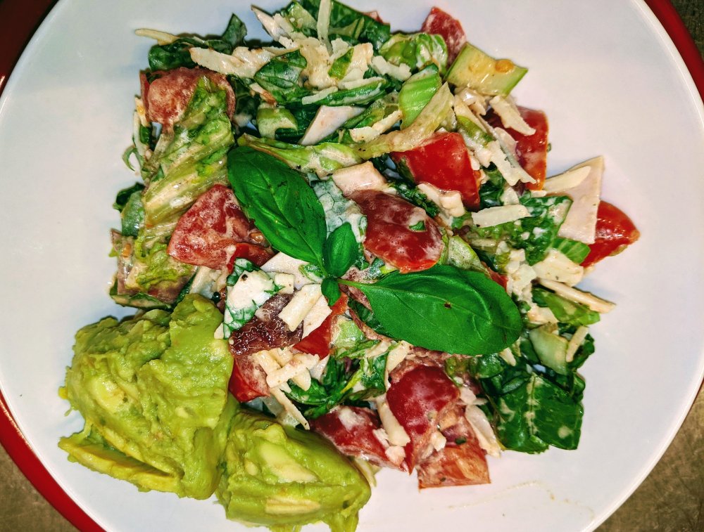 Combine the dressing and mayonnaise 1:1 so, 1 part mayo to 1 part dressing. Pour that over the salad and mix the whole thing up. Be careful not to over dress the salad you want it we’ll dressed 😉, but not dripping in dressing. Finally sprinkle with fresh pepper.