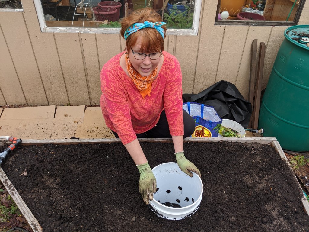 So the way you do this is to start by digging a hole for your bucket which can be sized according to the size of your garden area You cut or drill 3/8-in to 1/2-in holes all throughout the sides of the bucket and a few down at the bottom of the bucket You place the bucket into the hole fill it in around the edges with dirt and then you’re going to start placing your material or matter for the worms. First you fill the bucket about 1/3 full with compost or manure and then you lay down some paper, shredded newspaper, other types of shredded paper, shredded thin cardboard just some sort of bed of paper and then another thin layer of compost. Then you pile in a couple of handfuls of your worms which are composting worms like red wigglers and a few other kinds all mixed in with their dirt and castings and then you top it off by covering them with lots of vegetation and raw leftover vegetable matter that you collect for your compost bin. Next you have to give them water because they need water to breathe so you want to make sure that the water comes up just to the top of the dirt not covering all of that vegetable matter at the top and then you’re going to cover the bucket It doesn’t have to be tightly covered but you don’t want the wind to blow off of it so if you have a windy area you might want to put a rock or something on top of the lid. You want to make sure to put the lid on not just to keep things out of it but also worms do not like light so this will allow them to live in the dark and come up and grab the food and eat it and turn all of that into poop which is their worm castings which is what is going to feed your garden and be amazing fertilizer. As the food gets low they will leave the bucket through the holes go out into your garden and act similar to earthworms and turn your soil over while they are still pooping out worm castings and improving your soil which is really really needed in some of our beds.