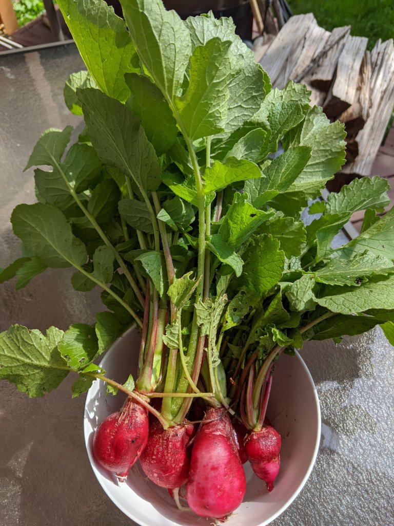 As for the greenhouse we have plenty of greens growing and some onions and carrots I wanted you to see that we saved one of the tomato plants in fact it survived the winter and now has quite a few tomatoes on it. Some of them are turning red as you can see from the picture. And then today I just pulled a big bunch of beautiful radishes for which I will be using the greens to make soup and of course the radishes will be for our wonderful fresh salads.