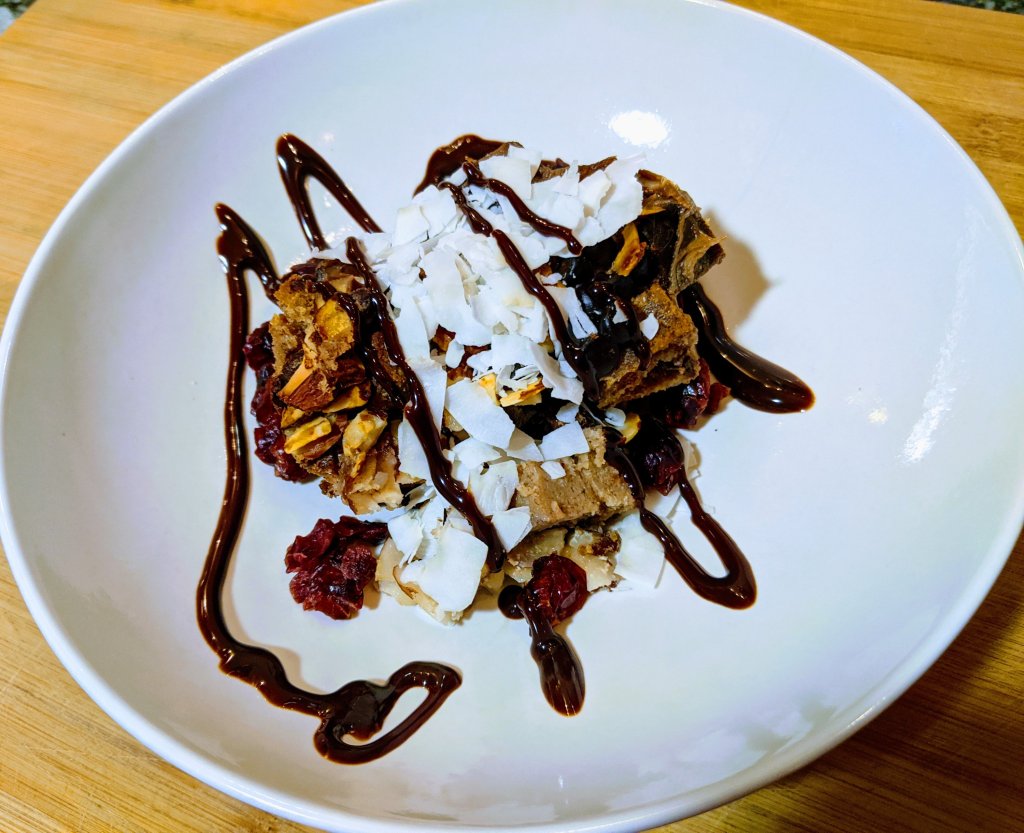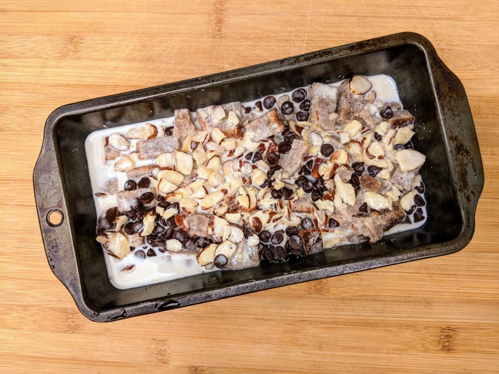 How to do it: Lightly spray a loaf pan or casserole dish the size that will hold you muffins with oil. In a bowl break up your muffins or bread into large bite sized pieces. (Do not crumble it or you will have mush) Mix in 1 or 2 of your mix-ins, don’t go overboard or it will be too rich and over the top. Spread this into you pan/dish. Sprinkle the top with nuts or coconut (I like to put my nuts or coconut on top because they get toasted that way and to me it’s more delicious) Add your sweetner if using, to you milk, stir it up and pour that over the whole thing making sure that you almost cover the mixture. Now, using the back of a big spoon press the mixture down a little bit so it is covered by the milk. Place the pan in a preheated 350° oven for about 40 to 45 minutes depending on the size. It should be bubbly around the edges and toasted on top. Remove from the oven to cool.