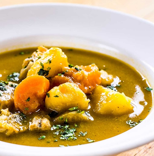 In a large pot heat 2 TB avocado oil add the stew meat, garlic, and onions and sauté until onions start to sweat and meat is browned on all sides. Add potatoes, carrots, plantain, tomatoes, water and last 3 ingredients. Bring to a boil then reduce heat and simmer several hours. Simmering Will allow the flavors to develop without overcooking the vegetables. If you boil a soup or stew for too long it will turn the vegetables to mush and the flavors will not develop as fully.