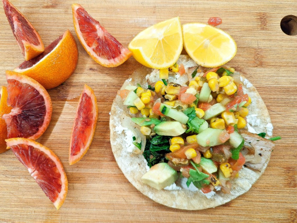 Mix together diced avocado, roasted corn (Frozen, thawed from Trader Joe’s), chopped cilantro, and some of your favorite fresh pico De Gallo salsa. Drizzle this with fresh lime juice and a touch of salt and stir it all up.