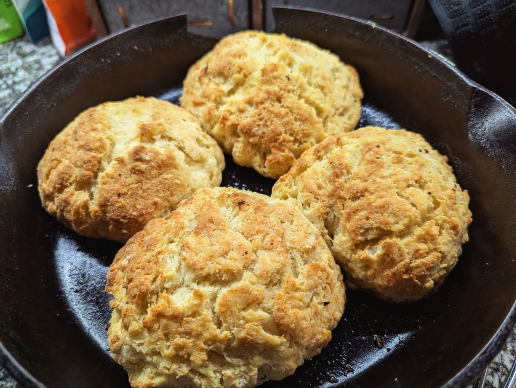 Wow, these biscuits turned out so well. Look at how beautiful they are. I used half Greek yogurt and half goat milk and I rubbed them with bacon grease before I put them in the oven. And man did it make them tasty!