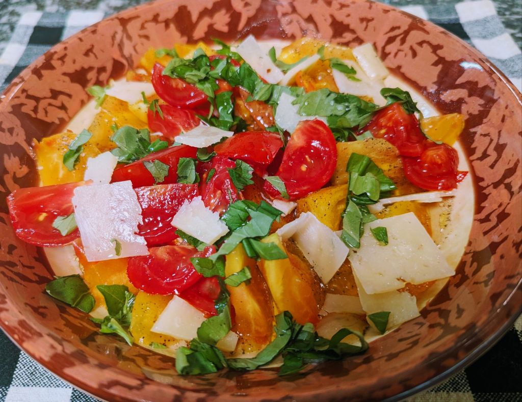 OMG this salad turned out amazing. It is so simple. Even your child could do it. All you do is take fresh, only fresh good sweet tomatoes, these are from my garden. Cut those tomatoes into quarters. Place in a low bowl, drizzle with very good olive oil and white balsamic vinegar, salt and fresh ground pepper. Then top with shavings of manchengo cheese or you could use parmesan reggiano and then sprinkle with fresh julienne basil which I did pull earlier from my garden.